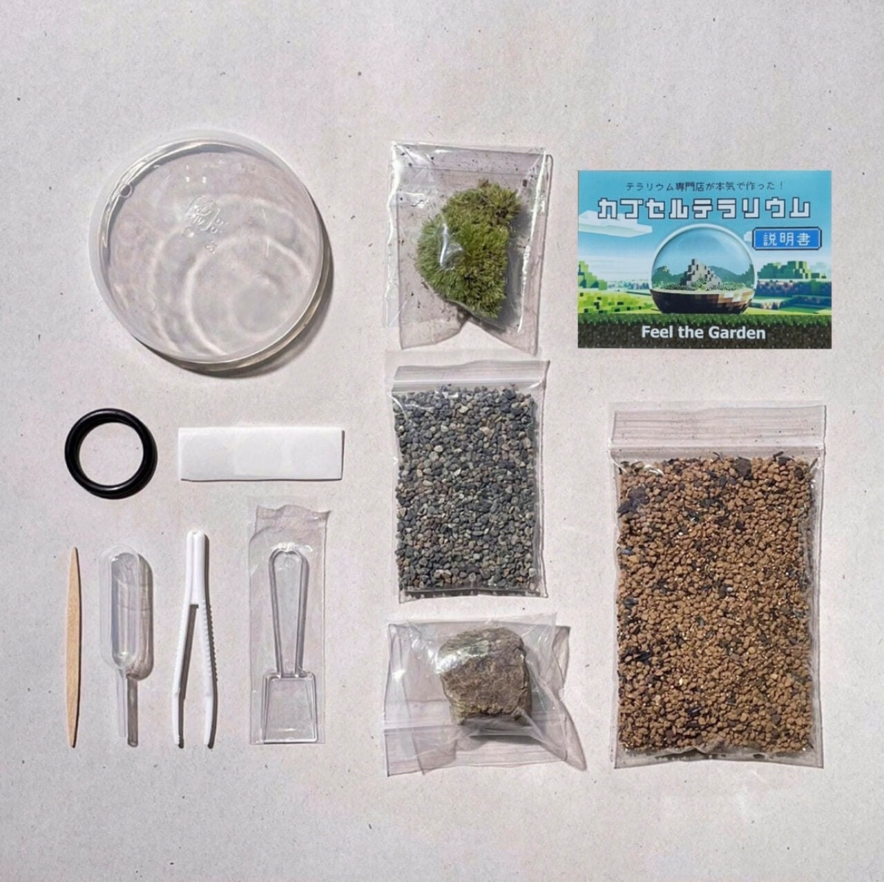 苔テラリウムの作成に必要な道具や材料がセットになっており、
